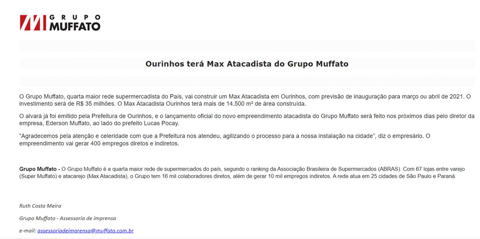 A nota afirma ainda, que o lançamento oficial do novo empreendimento atacadista do Grupo Muffato será feito nos próximos dias pelo diretor da empresa, Ederson Muffato, ao lado do prefeito Lucas Pocay.