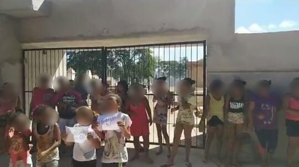 Crianças seguram cartazes com os dizeres "Porco aqui não". "Lugar de porco é no chiqueiro".