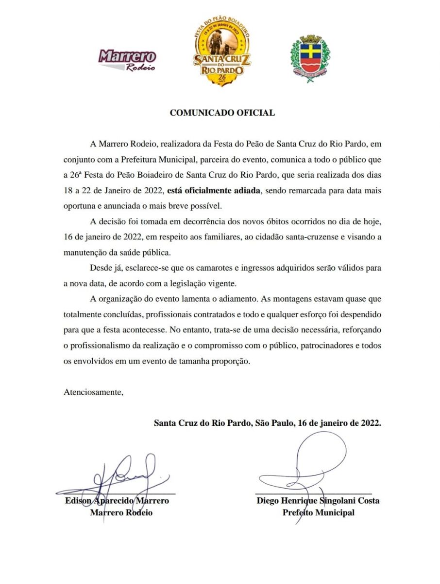 A Prefeitura de Santa Cruz do Rio Pardo e a empresa organizadora, “Marrero Rodeio”, anunciaram, na tarde deste domingo, 16, o adiamento da 26ª Festão do Peão, que estava marcada para iniciar nesta terça-feira, dia 18. Uma nova data deverá ser divulgada nos próximos dias.