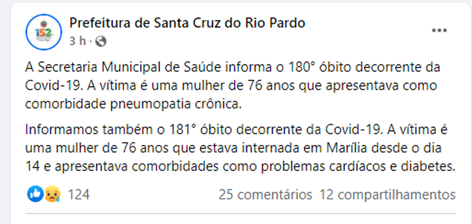 O anúncio foi feito pelas redes sociais e a motivação principal foram os registros de mais dois óbitos em decorrência da Covid-19, de moradoras Santa Cruz do Rio Pardo. Duas mulheres de 76 anos faleceram em decorrência do vírus. Confira as publicações abaixo: