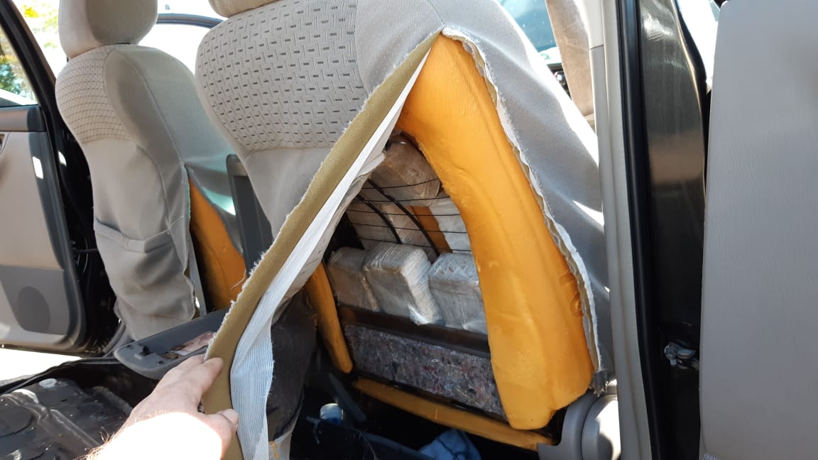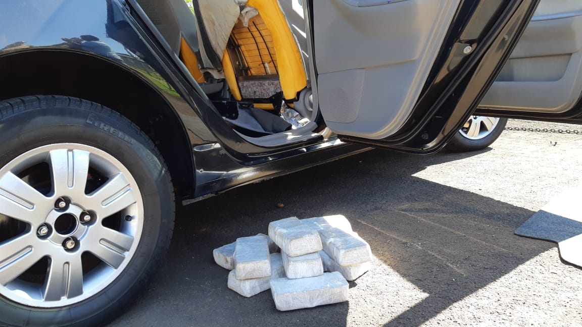 Abordado o veículo foi constatado na sua condução um aposentado de 60 anos, acompanhado da sua esposa, sua enteada e mais a sua companheira. Em revista preliminar nada foi encontrado, indagado condutor a respeito das circunstâncias da viagem, informou que deslocava de Terra Roxa (PR) em viagem de passeio para uma cidade da qual não se recordava o nome onde mora o primo de sua esposa, indagada sua esposa, informou que iria a princípio para Ribeirão Claro (PR), onde mora sua mãe e que posteriormente seguiria para outra cidade onde mora o primo. Diante da suspeita o veículo e seus ocupantes foram encaminhados para revista e busca mais aprofundada com apoio da equipe do Canil da PMPR onde foi localizado no interior dos encostos dos bancos dianteiros 10 volumes de substância aparentando tratar-se de Crack, que pesados totalizaram 10,44 Kg. Localizados os entorpecentes o aposentado admitiu estar recebendo R$3 mil para entregar a quantidade encontrada na cidade de Chavantes-SP. Condutor preso pelo crime de tráfico de entorpecentes e encaminhado para cadeia pública de Jacarezinho (PR), demais ocupantes foram liberados.