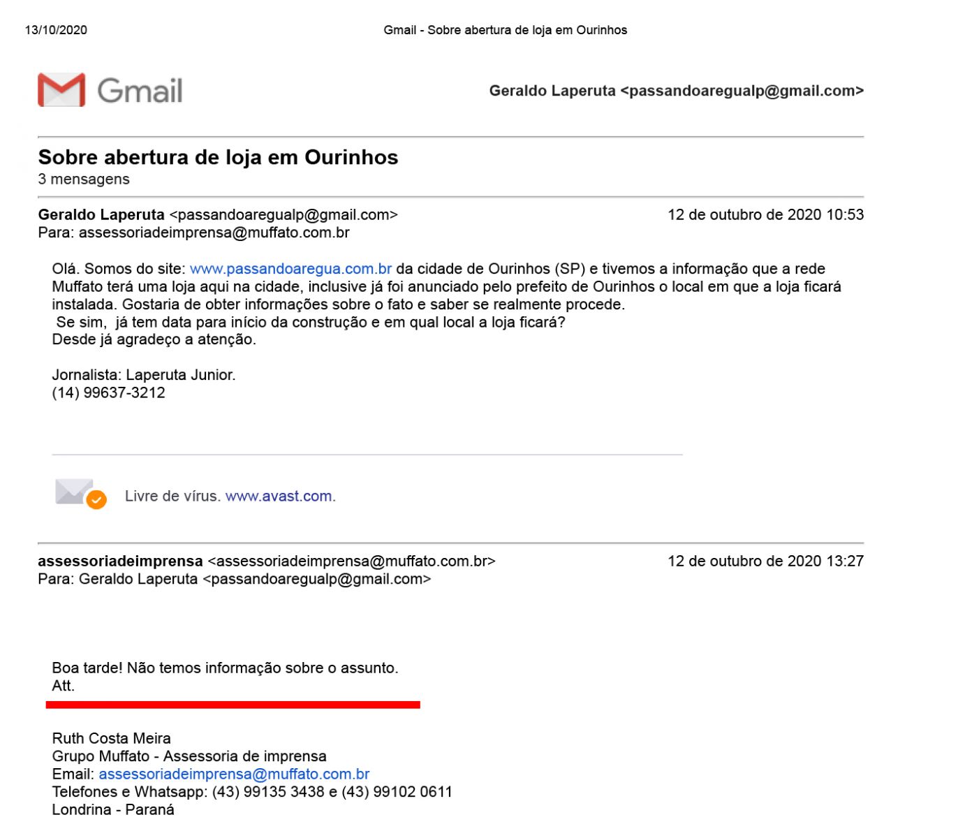 No último domingo, 11, o prefeito de Ourinhos, Lucas Pocay (PSD), usou suas redes sociais para afirmar que a cidade de Ourinhos receberá muito brevemente uma loja do setor atacadista, pertencente ao Grupo Muffato, que é uma grande rede de supermercados do estado do Paraná. O Passando a Régua entrou em contato com a assessoria de imprensa do grupo hipermercadista que não confirmou o fato, dizendo que não há informação sobre o assunto, conforme cópia do e-mail abaixo:
