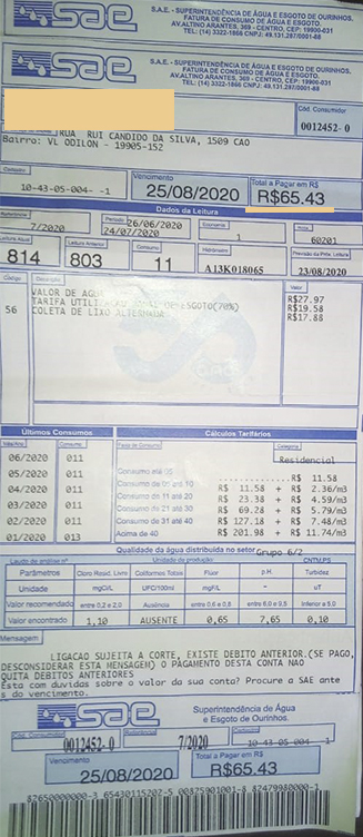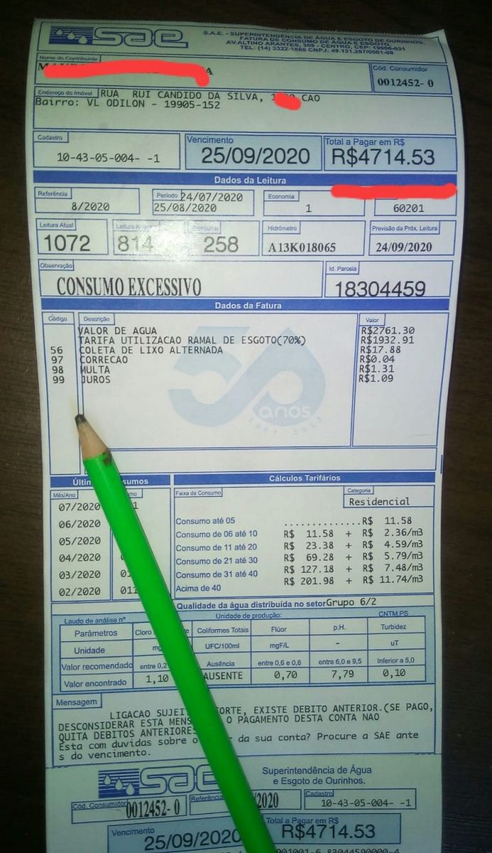Um autônomo de 48 anos recebeu nesta terça-feira, 25, em sua casa, na Vila Odilon, em Ourinhos, uma conta de água de R$4.714,53. O caso ganhou repercussão nas redes sociais após Luís Antônio de Paula gravar um áudio, que se espalhou em vários grupos pelo WhatsApp. (confira o áudio acima)
