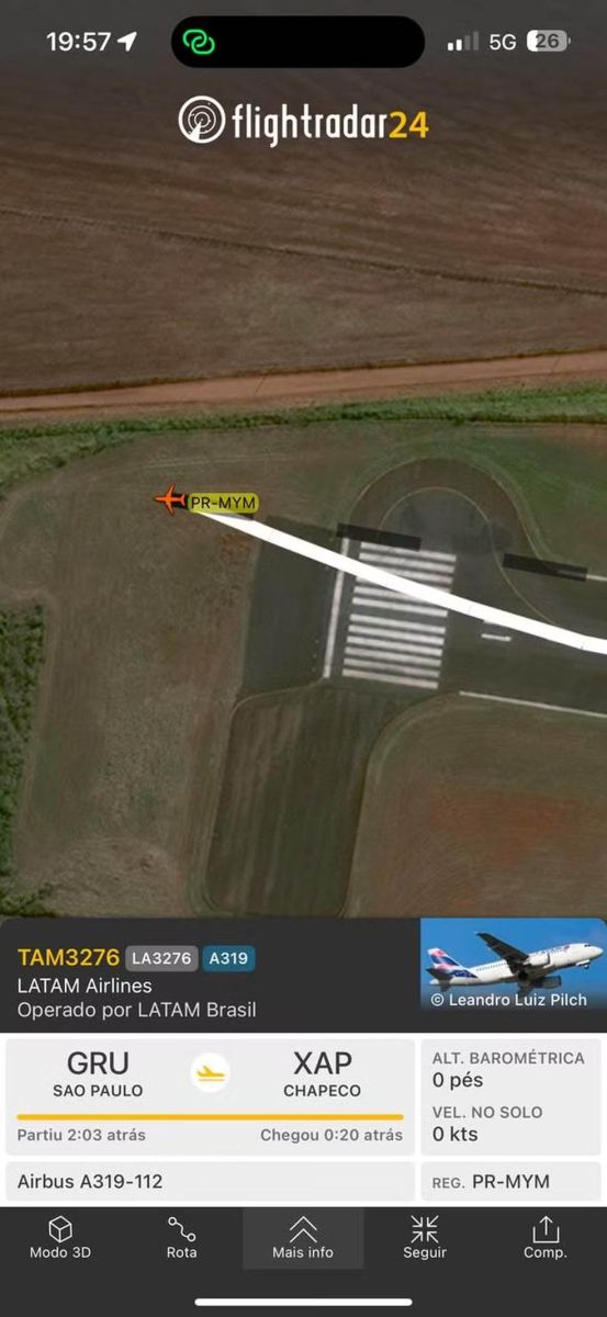 A aeronave operava o voo LA3276, que saiu de Guarulhos (SP) com destino a Chapecó. Em nota, a Latam informou que todos os passageiros desembarcaram em segurança e que o voo LA3277, que faria o trajeto inverso na mesma noite, foi cancelado.