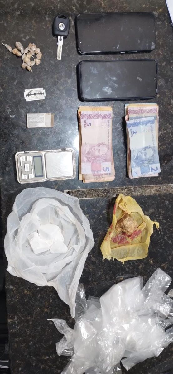 No imóvel indicado, com apoio do cão farejador K9 Draco, os policiais localizaram um pote com porções de cocaína (59g), crack (3,4g), uma balança de precisão, lâminas com vestígios de droga e R$ 400,00 em espécie. Uma segunda casa utilizada pelo suspeito foi vistoriada, mas nada foi encontrado.