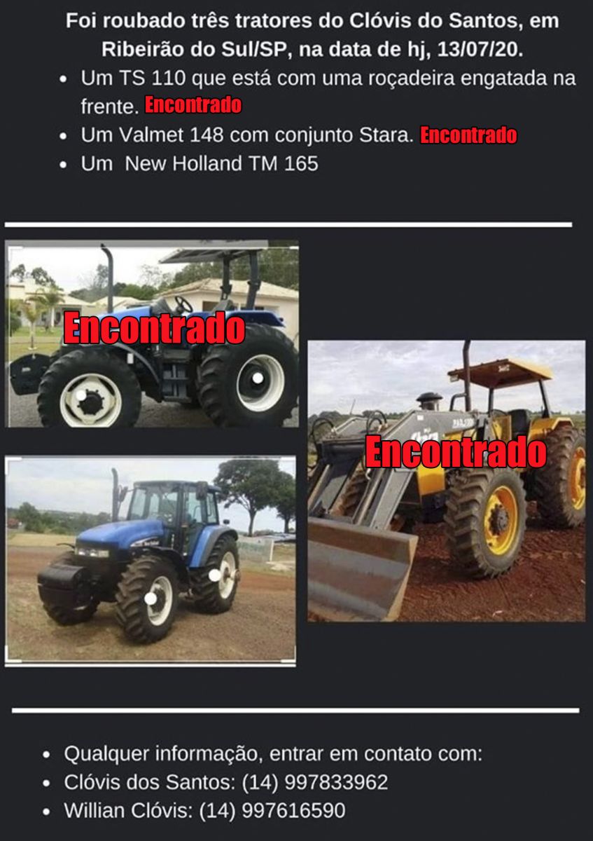 Clóvis dos Santos já conseguiu reaver dois de seus tratores, que foram localizados em meio a um matagal em uma área rural nas proximidades de Salto Grande. Ninguém foi preso.