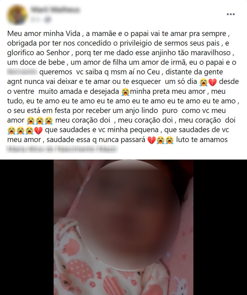 A bebê foi sepultada, na tarde desta segunda-feira (28), no Cemitério Municipal do distrito de Nova Pátria, em Presidente Bernardes (SP) (217 km de Ourinhos).