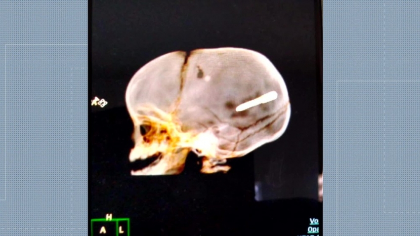Uma radiografia mostra que o objeto está alojado no crânio do bebê. A família contou para a polícia que o menino estava no colo da mãe, dentro do carro, quando eles ouviram um forte estampido e viram que o neném tinha sido atingido pelo prego. O objeto, segundo os pais do bebê, parecia um dardo onde é colocado gesso em obras.