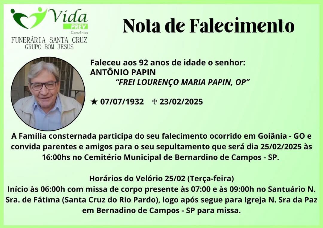 Natural de Bernardino de Campos (SP), Frei Papin dedicou sua vida à fé, à caridade e ao serviço ao próximo. Mesmo distante nos últimos anos, manteve fortes laços com sua cidade natal, onde será velado e sepultado nesta terça-feira (25).