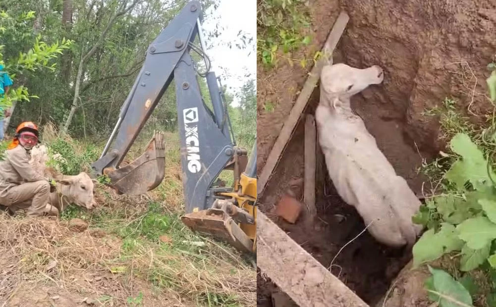 A Defesa Civil solicitou apoio da prefeitura, que enviou uma retroescavadeira ao local. A máquina abriu uma rampa de acesso ao buraco, permitindo que o animal saísse por conta própria. Assustado, mas ileso, o boi foi encaminhado aos cuidados do dono da propriedade até a chegada do responsável.