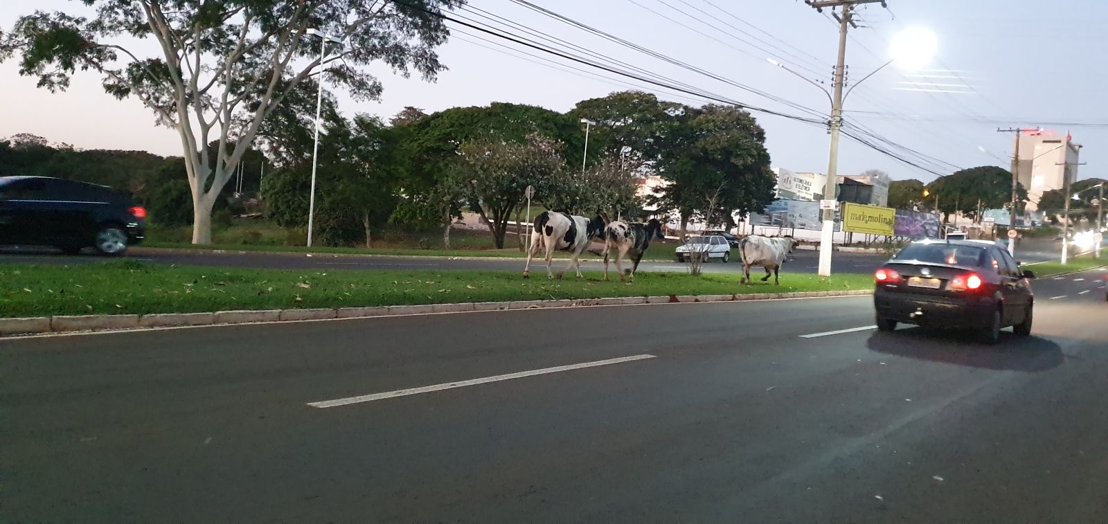 Três bovinos assustaram motoristas que passavam pela Avenida Luiz Saldanha Rodrigues, no início da noite desta terça-feira, 7, na região do bairro Nova Ourinhos.