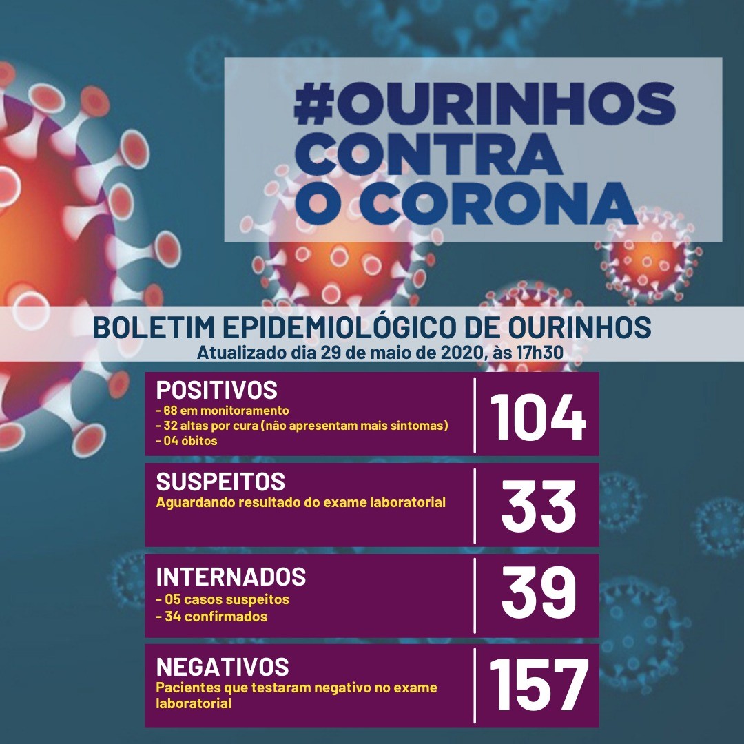 De acordo com o último “Boletim Coronavírus” divulgado pela Prefeitura de Ourinhos na noite desta sexta-feira, 29, a cidade já confirmou 104 casos de Covid-19, sendo que 32 tiveram cura, quatro morreram e outras 68 pessoas ainda estão sendo monitoradas. Ainda segundo a Prefeitura, entre os confirmados, ou seja, dos 68, 34 estão internados, portanto a metade. (veja a imagem abaixo).