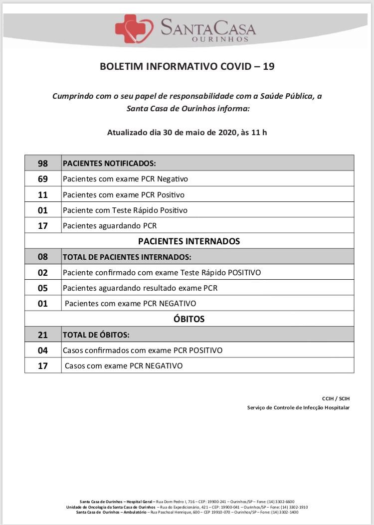 Boletim da Santa Casa de Ourinhos do dia 30/05/2020