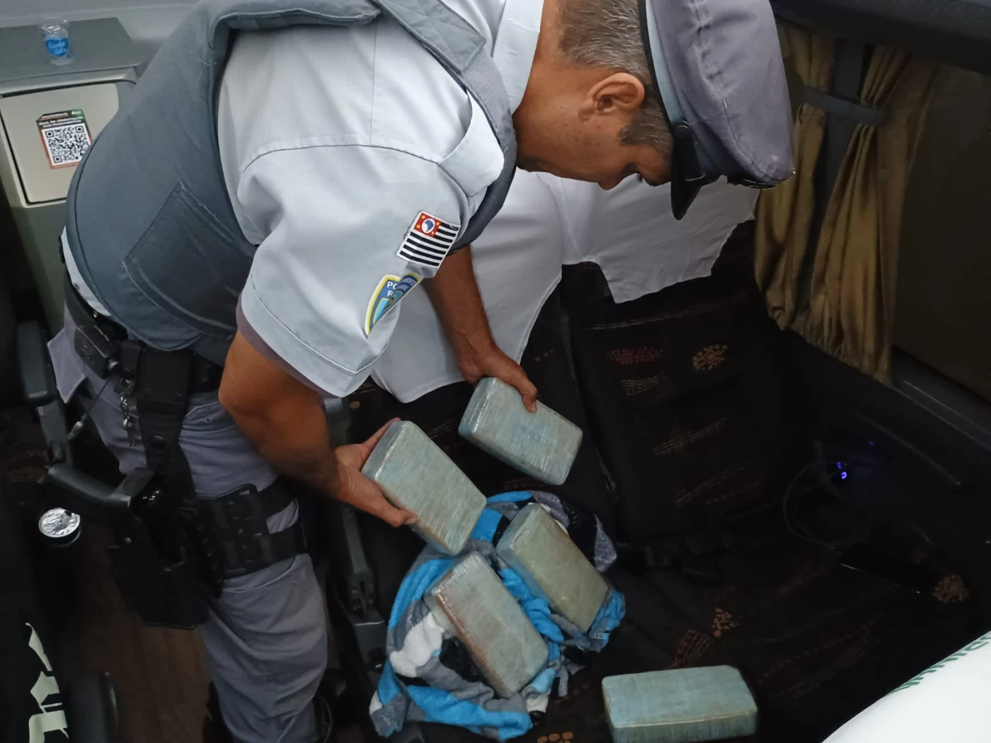 Durante patrulhamento ostensivo, policiais militares abordaram um ônibus interestadual da empresa Andorinha, que fazia o trajeto de Campo Grande (MS) para o Rio de Janeiro (RJ). Durante a vistoria, nada de ilícito foi encontrado nas bagagens dos passageiros. No entanto, ao revistar os assentos de número 41 e 42, os agentes localizaram cinco tabletes de cocaína escondidos em um fundo falso.