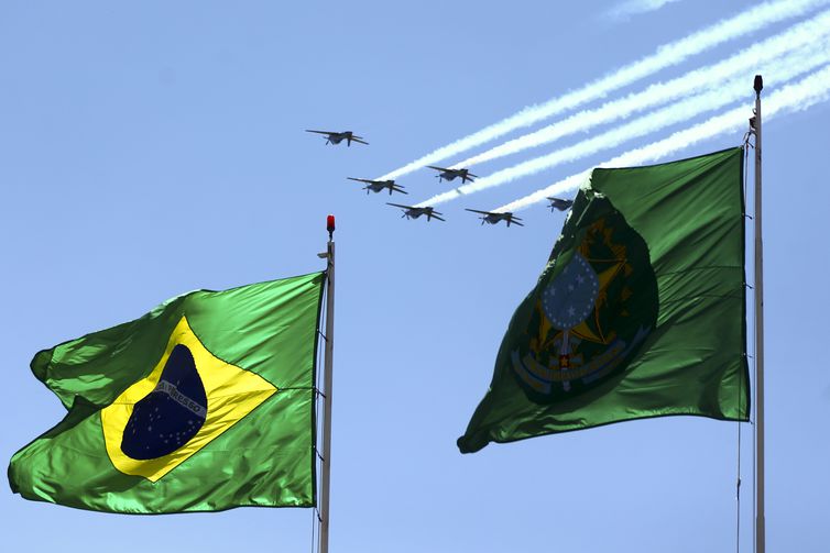 Logo depois de o presidente se posicionar diante da bandeira, a Esquadrilha da Fumaça escreveu no céu a palavra “Brasil”, marcando o início da cerimônia de hasteamento, que ocorreu sob o som do Hino Nacional, executado pela Banda do Batalhão da Guarda Presidencial.