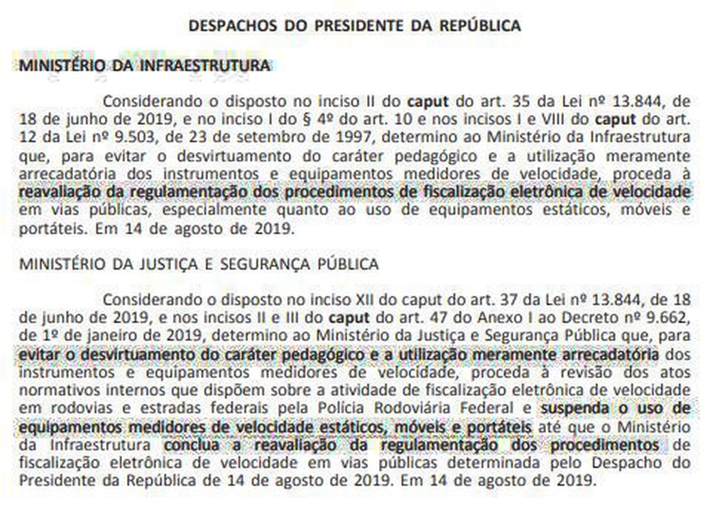 Suspensão do uso de radares móveis publicada em despachos do presidente Jair Bolsonaro no 'Diário Oficial da União' desta quinta-feira (15) — Foto: Reprodução/Diário Oficial da União