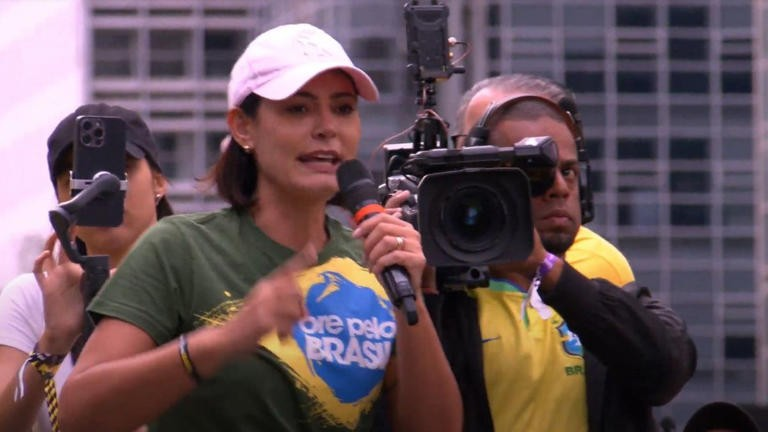 A ex-primeira-dama Michelle Bolsonaro também discursou e pediu um “grito de força” ao deputado licenciado Eduardo Bolsonaro (PL-SP), que está nos Estados Unidos. Ela afirmou que Eduardo “renunciou à vida” no Brasil para denunciar “a injustiça” da situação.