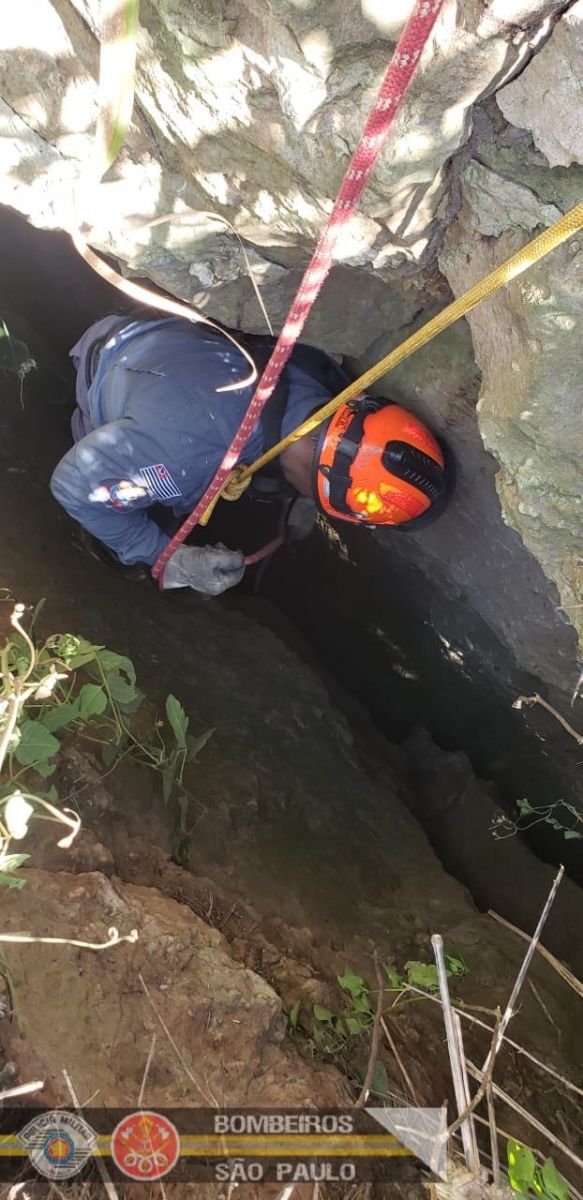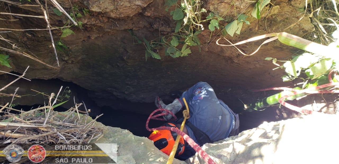 Uma cachorra que estava desaparecida em uma chácara na zona sul de Marília (SP) (90 km de Ourinhos) foi resgatada na tarde desta quinta-feira, 18, pelo Corpo de Bombeiros no fundo de uma fenda no solo, com mais de oito metros de profundidade.