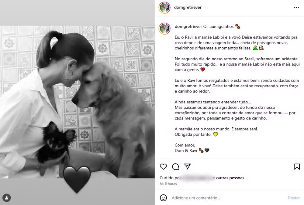 Durante o trajeto de volta ao Brasil, o carro saiu da pista e capotou. A mãe de Labibi foi socorrida e levada a um hospital da região, onde recebeu alta e está em recuperação. Os dois cães sobreviveram ao acidente. Um deles, Ravi, chegou a se perder, mas moradores da cidade se mobilizaram e conseguiram resgatá-lo.