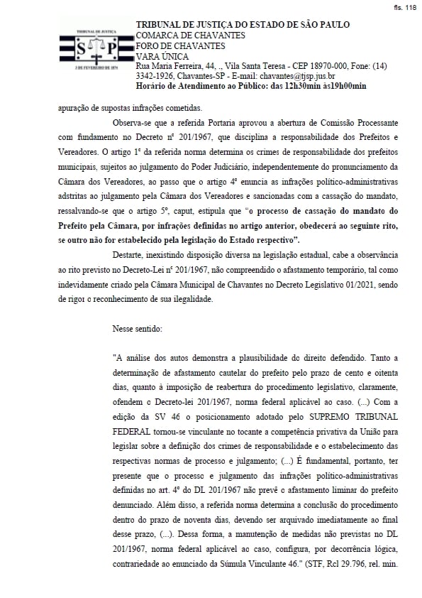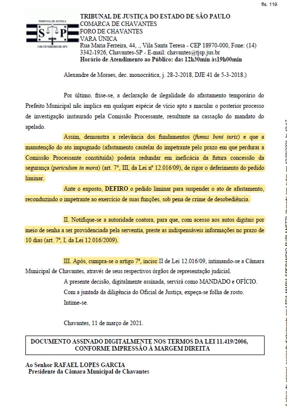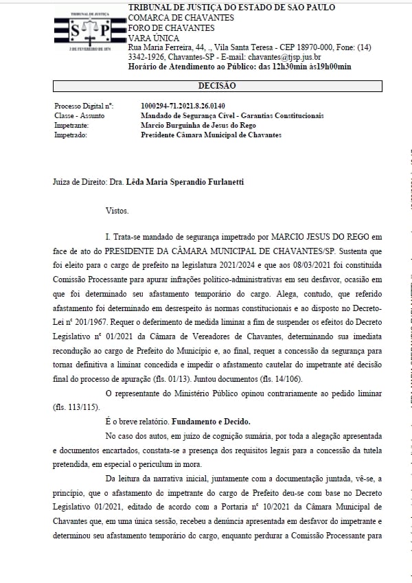 O prefeito de Chavantes Márcio Burguinha (PSDB) conseguiu na justiça uma liminar que o reestabeleceu no cargo após o seu afastamento Câmara, que instaurou uma CP (Comissão Processante) para apurar denúncia de suposta manipulação de pareceres e fraude a licitação em seu governo.