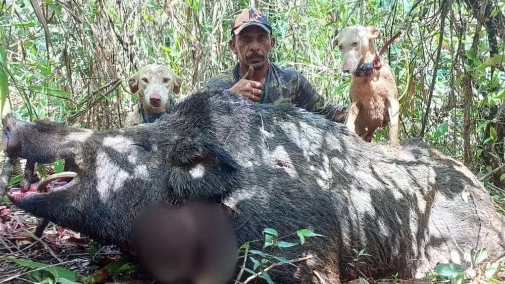 Dois caçadores abateram um javali com cerca de 300 quilos na zona rural de João Pinheiro, no Noroeste de Minas Gerais, na última semana. O animal foi localizado com apoio de cães farejadores treinados com GPS após mais de 5 km de rastreamento em área próxima a uma usina de cana-de-açúcar.