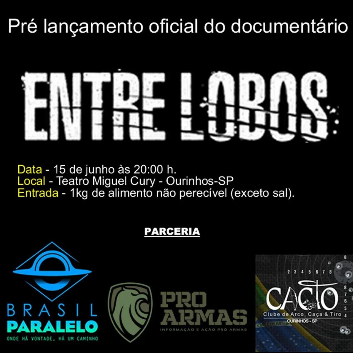 O CACTO (Clube de Arco, Caça e Tiro de Ourinhos) promove, nesta quarta-feira, 15, no Teatro Municipal “Miguel Cury” de Ourinhos, o pré-lançamento oficial do documentário, “Entre Lobos”, que é uma produção do site “Brasil Paralelo”. O evento, marcado para às 20h, fará arrecadação de alimentos não perecíveis, portanto, para entrar, é preciso deixar na portaria um quilo de alimento, exceto sal.
