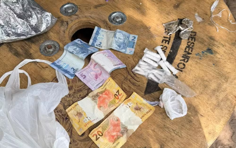 Ao chegarem ao local, os policiais encontraram Gabriel Alves da Silva, conhecido como “Bigo Cadeirante”. O suspeito não apresentou resistência à abordagem e retirou dos bolsos de sua roupa cinco porções de maconha, 67 pinos de cocaína e R$ 55 em dinheiro.