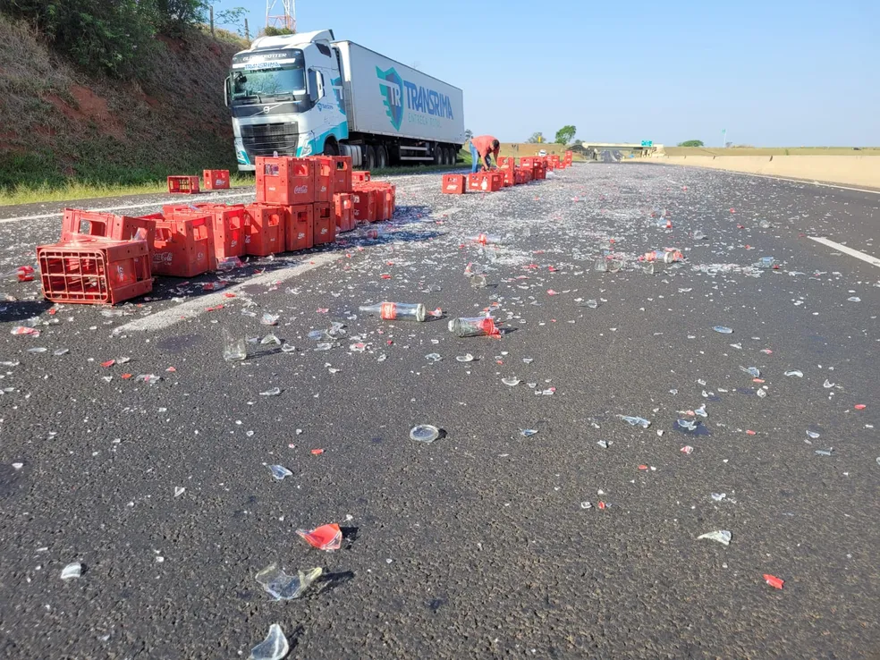 Caixas de garrafas de refrigerante ficaram espalhadas na Rodovia Engenheiro João Baptista Cabral Rennó (SP-225), em Santa Cruz do Rio Pardo (SP), na manhã deste sábado, 23. As informações são do g1.