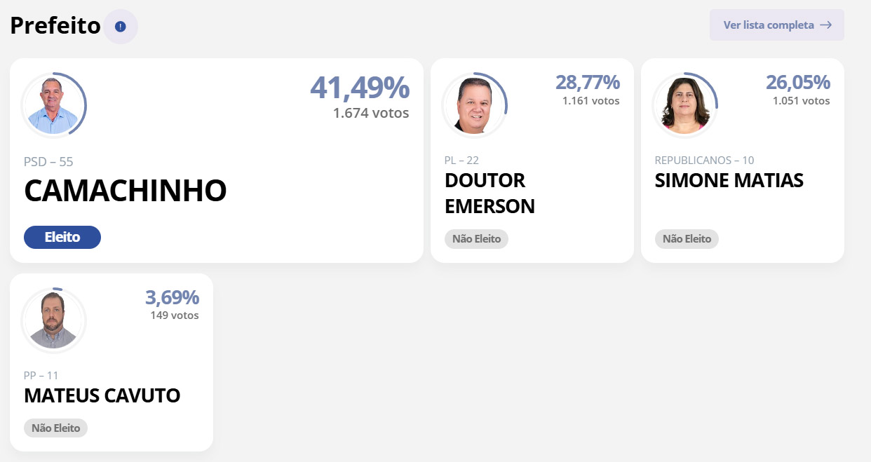 O segundo colocado, Doutor Emerson (PL), obteve 1.161 votos, correspondendo a 28,77% dos votos. Simone Matias (REPUBLICANOS) ficou em terceiro, com 1.051 votos (26,05%), e Mateus Cavuto (PP) foi o quarto, recebendo 149 votos (3,69%).