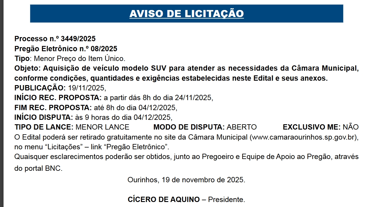 A Câmara Municipal de Ourinhos lançou o edital de Pregão Eletrônico nº 8/2025 para a aquisição de três veículos novos do tipo SUV. O processo licitatório prevê um investimento total estimado de R$ 537.180,00 para a modernização da frota legislativa.