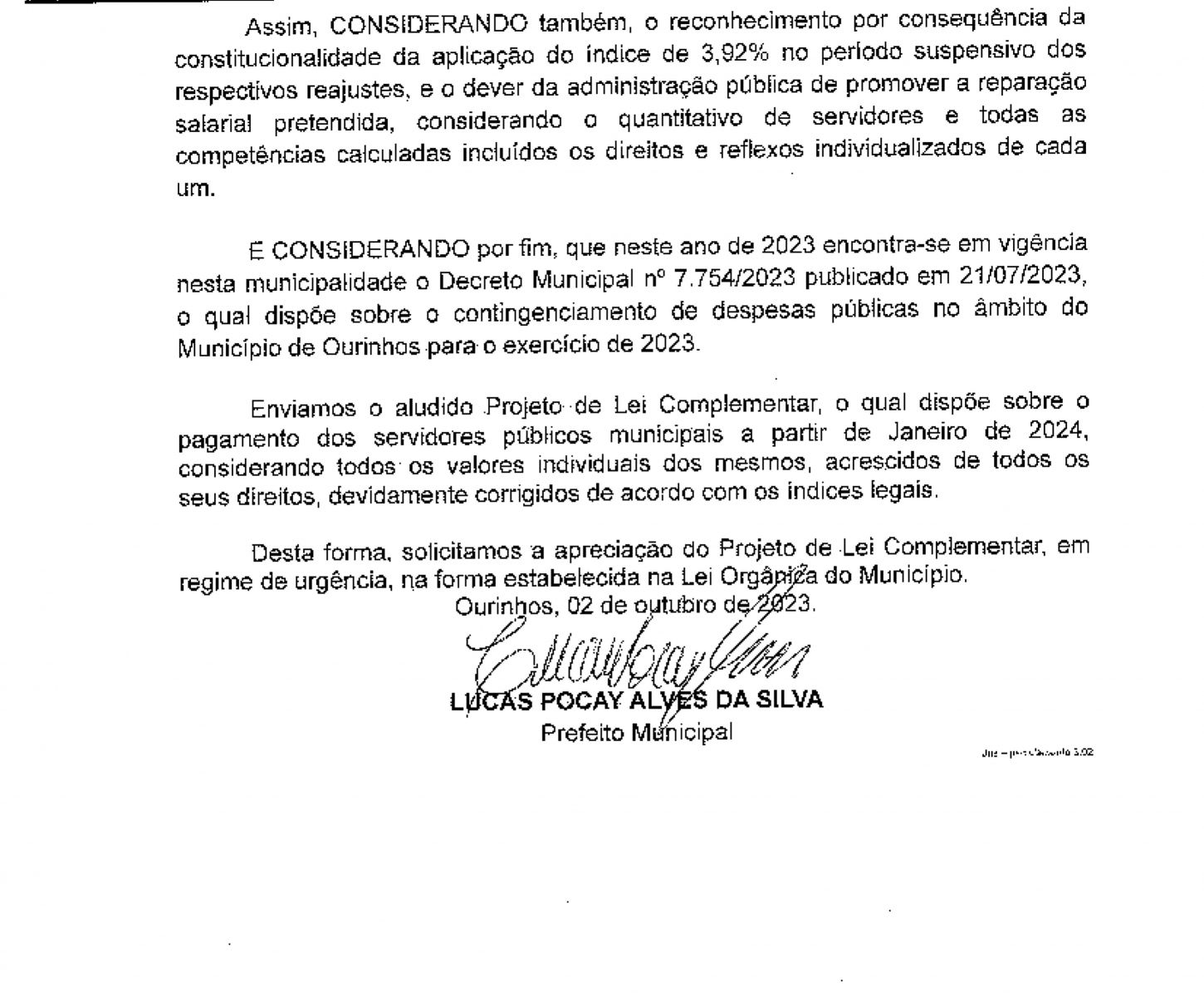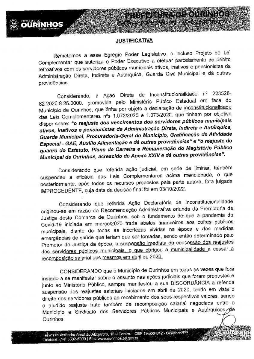 Essa medida se tornou necessária devido ao encerramento de um impasse relacionado ao pagamento retroativo do reajuste de 3,92%, que não foi realizado entre junho de 2020 e dezembro de 2022. A Prefeitura de Ourinhos retomou os pagamentos em janeiro deste ano, mas o pagamento retroativo está programado para iniciar em janeiro de 2024.