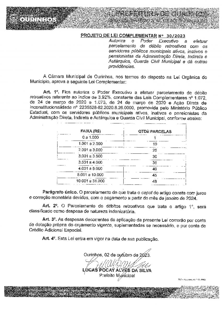 Na noite desta segunda-feira, 2 de outubro de 2023, em sessão extraordinária, a Câmara de Vereadores de Ourinhos aprovou por unanimidade a Lei Complementar nº 30/2023, que concede autorização ao Poder Executivo para efetuar o parcelamento de débitos retroativos com os servidores públicos municipais ativos, inativos, pensionistas, Guarda Civil Municipal e outros ligados à Administração Direta, Indireta e Autárquica.