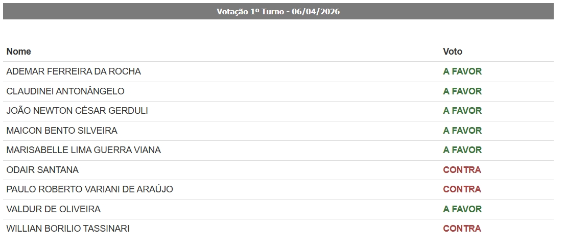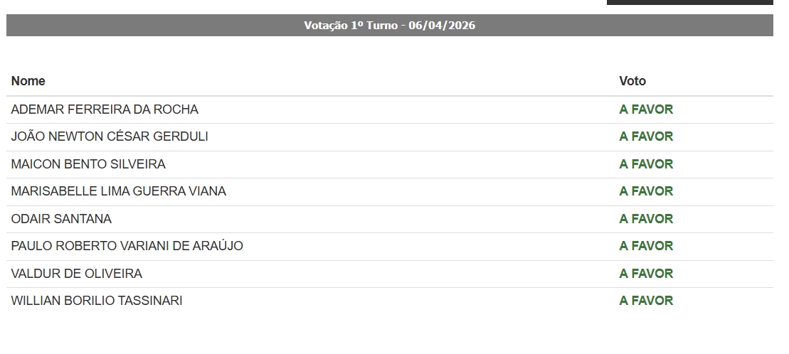 Na mesma sessão, os vereadores também aprovaram por unanimidade o projeto que prevê a recomposição salarial dos servidores da Câmara Municipal, incluindo comissionados. O reajuste será de 3,81% e passa a valer a partir de 1º de março de 2026.