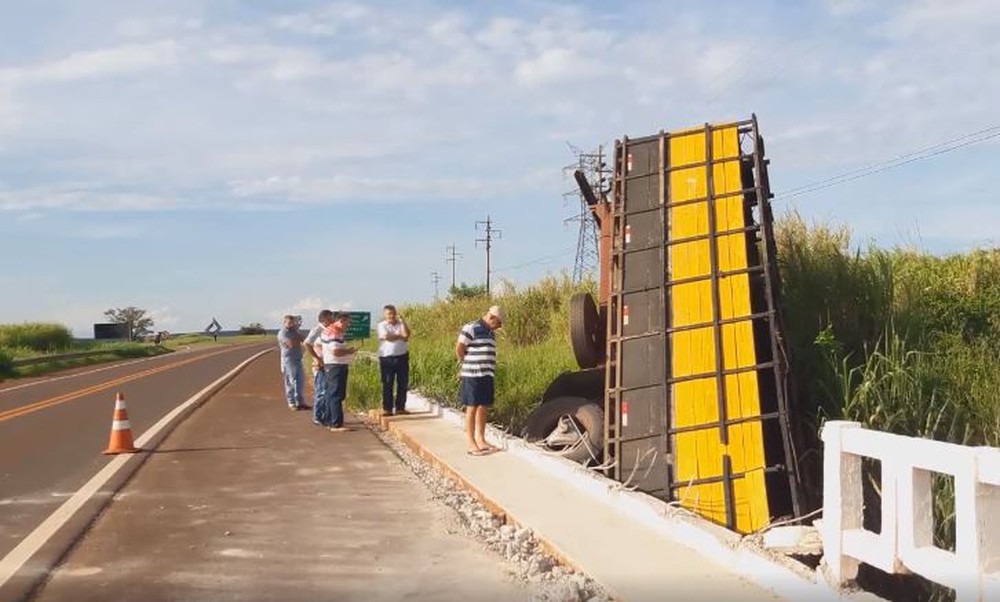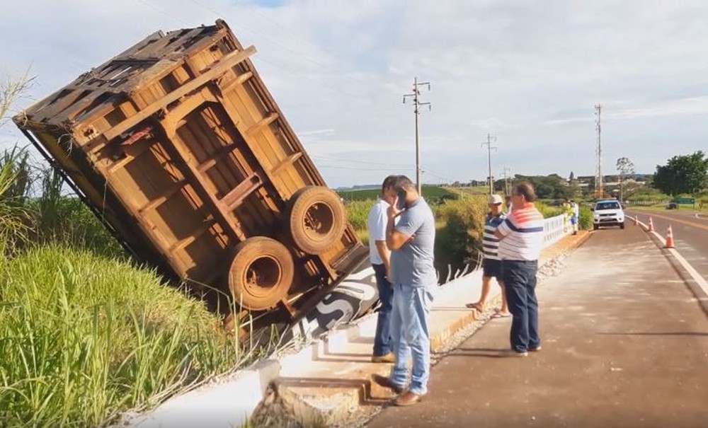 Um caminhão caiu de um viaduto da Rodovia Geraldo Martins de Souza, em Piraju (SP) (60 km de Ourinhos), na tarde de sábado (16).