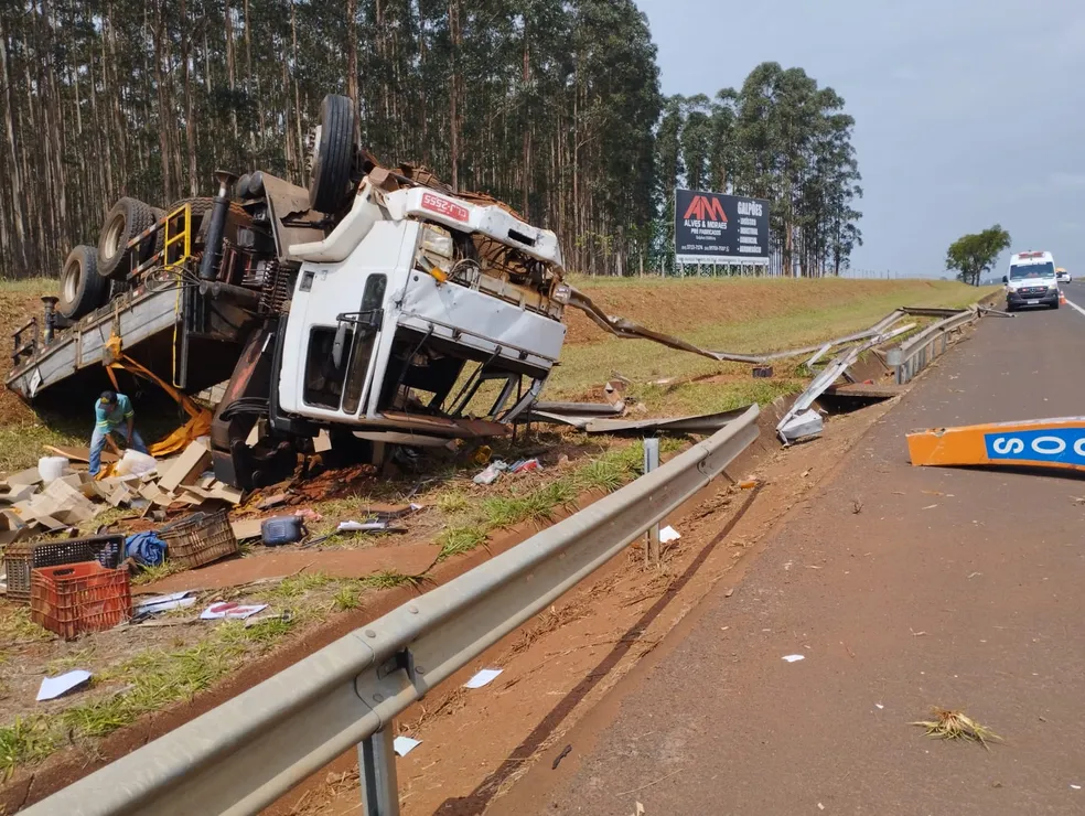 Um caminhão capotou, nesta segunda-feira (2), na Rodovia Marechal Rondon, SP-300, em Lençóis Paulista (SP) (156 quilômetros de Ourinhos).