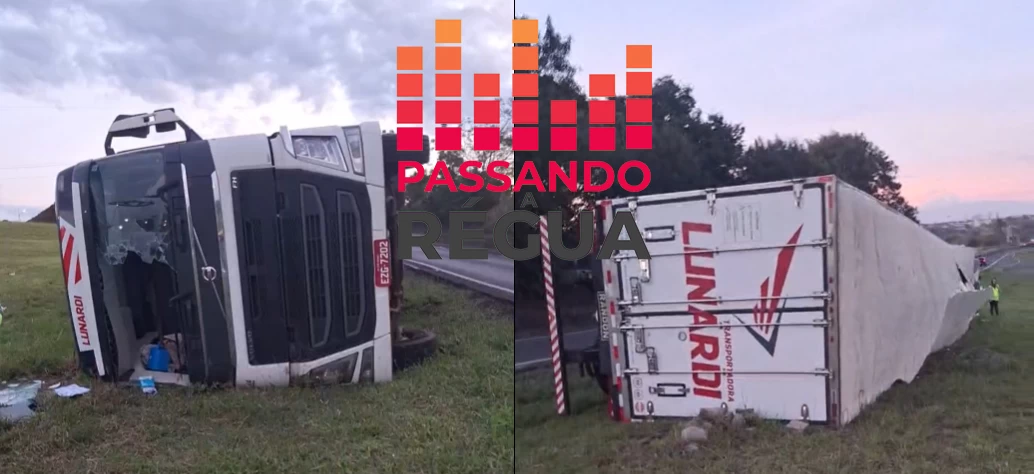 Um caminhão de transportadora, que transportava carga de carne, tombou no final da tarde desta sexta-feira (6) na BR-153, nas proximidades da praça de pedágio do Distrito de Marques dos Reis, em Jacarezinho (PR), na divisa com Ourinhos (SP).