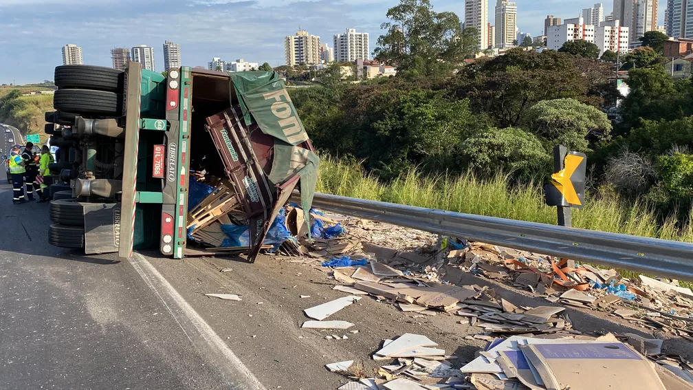 O caminhão estava carregado com piso e tombou no quilômetro 447 no sentido Bauru-Marília. De acordo com a Polícia Rodoviária, o motorista de 39 anos disse que perdeu o controle do veículo, pois estava mexendo no celular.