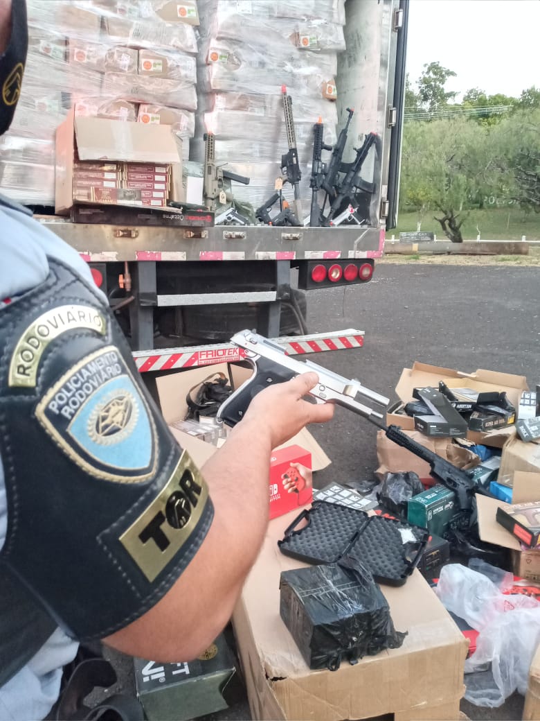 O condutor apresentou nervosismo e foi feita uma busca minuciosa no compartimento de carga, onde foram localizados: 55 caixas, contendo 50 pacotes, totalizando 27500 maços de cigarros, 13 réplicas de fuzil, 02 réplicas de revólver, 05 armas de pressão, 31 réplicas de pistolas, 500 perfumes e cosméticos, 40 videogames (PS4) e 100 aparelhos de celular.