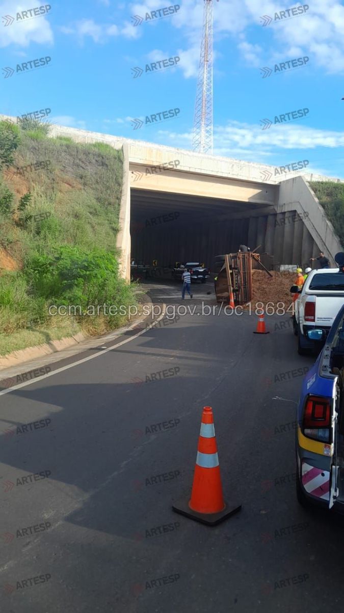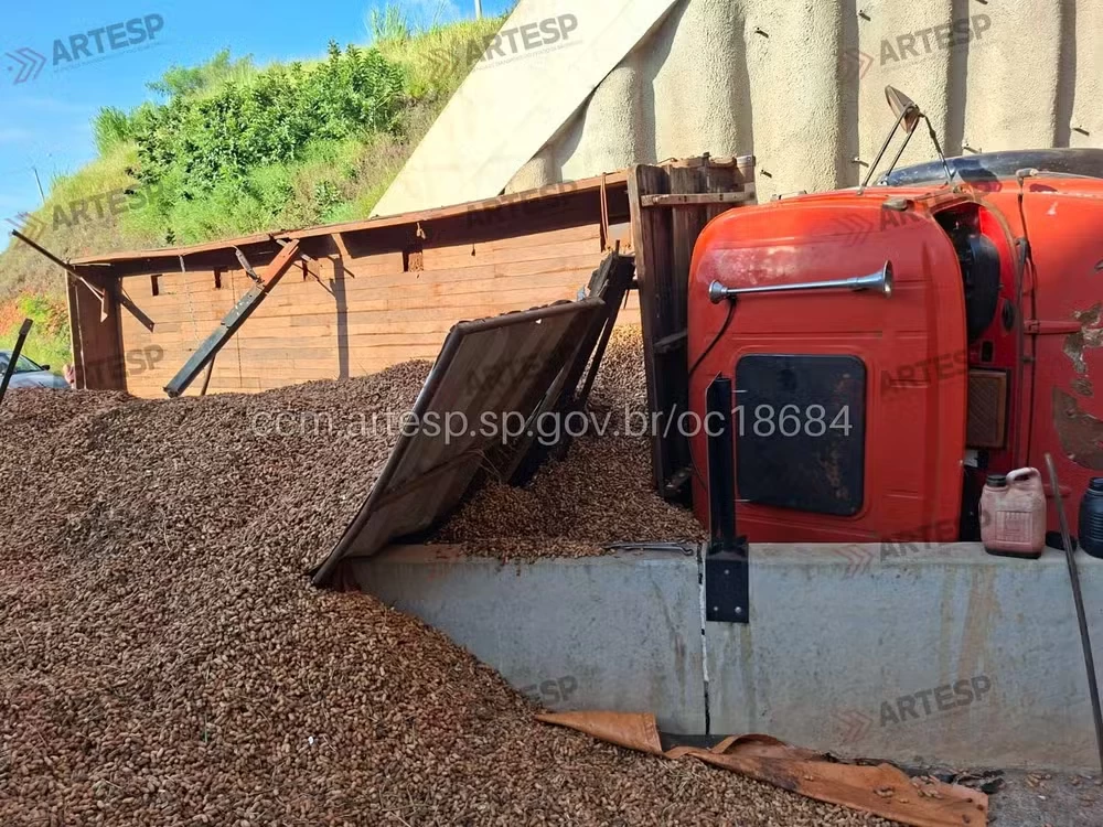 Um caminhão carregado de amendoim tombou na manhã desta sexta-feira (27) no km 269 da Rodovia SP-333, em Echaporã.