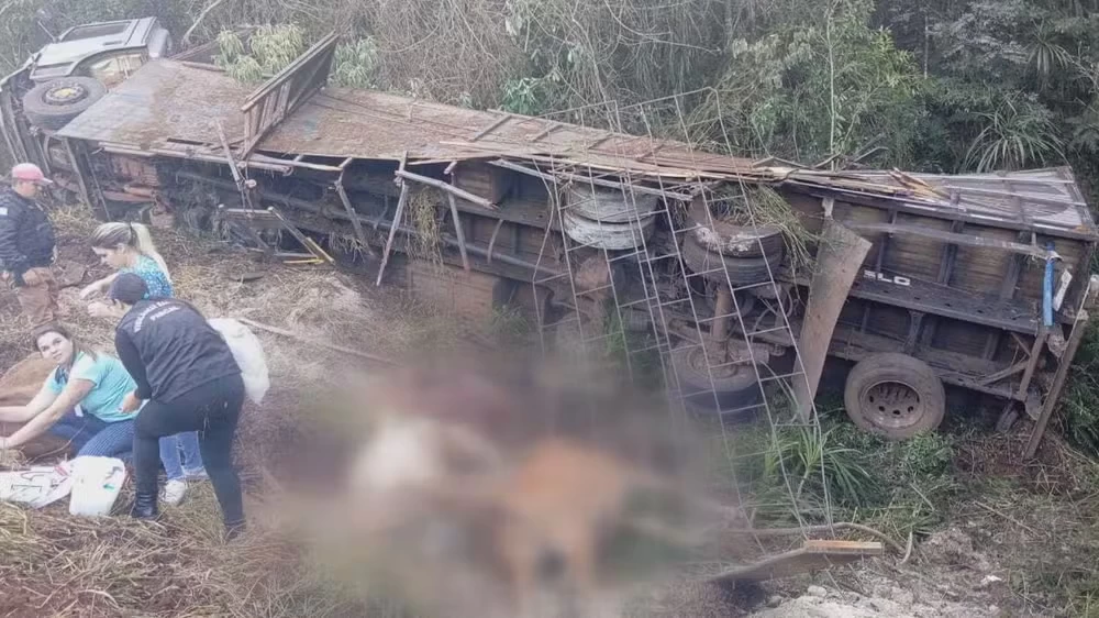 A carreta, de Coronel Sapucaia (MS), estava carregada com seis animais, que morreram no acidente.