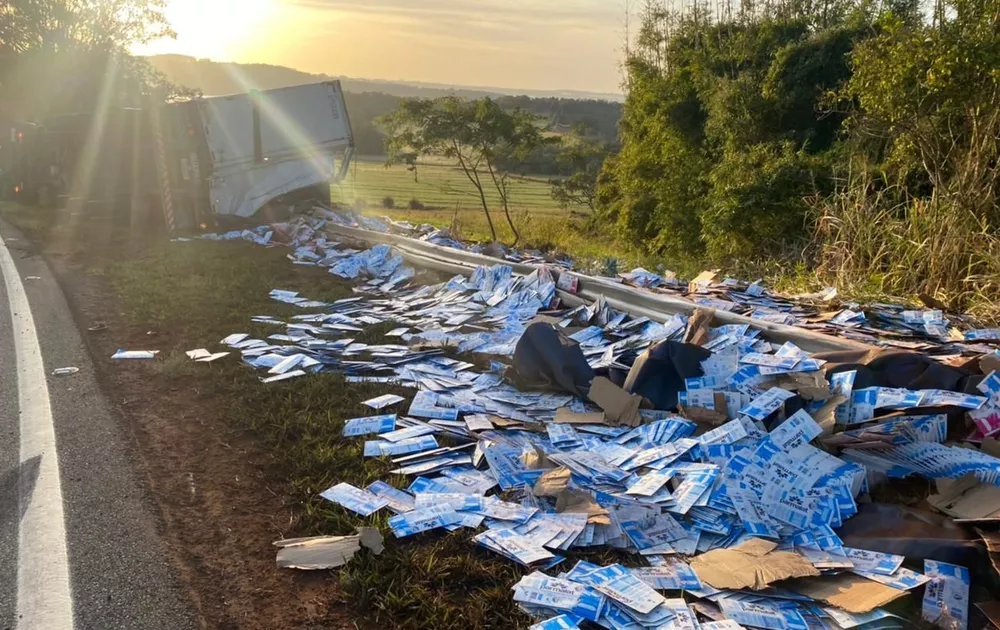 Segundo o Corpo de Bombeiros, o motorista do veículo perdeu o controle da direção ao fazer uma curva no quilômetro 8, por volta das 7h. Com o impacto, a carga ficou espalhada às margens da pista.