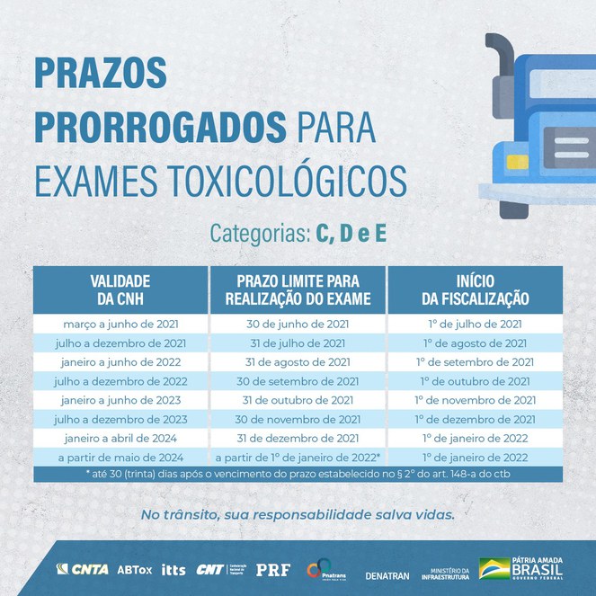 O Conselho Nacional de Trânsito (Contran) prorrogou os prazos para a realização do exame toxicológico periódico para o condutor habilitado nas categorias C, D e E. Publicadas na edição desta quarta-feira, 28, do Diário Oficial da União (DOU), as novas datas foram decididas por conta da pandemia de Covid-19, com amplo debate dentro do Fórum Permanente para o Transporte Rodoviário de Cargas (Fórum TRC), com a Associação Brasileira de Toxicologia (ABTOX), Confederação Nacional do Transporte (CNT), Confederação Nacional dos Transportadores Autônomos (CNTA) e a Polícia Rodoviária Federal (PRF).
