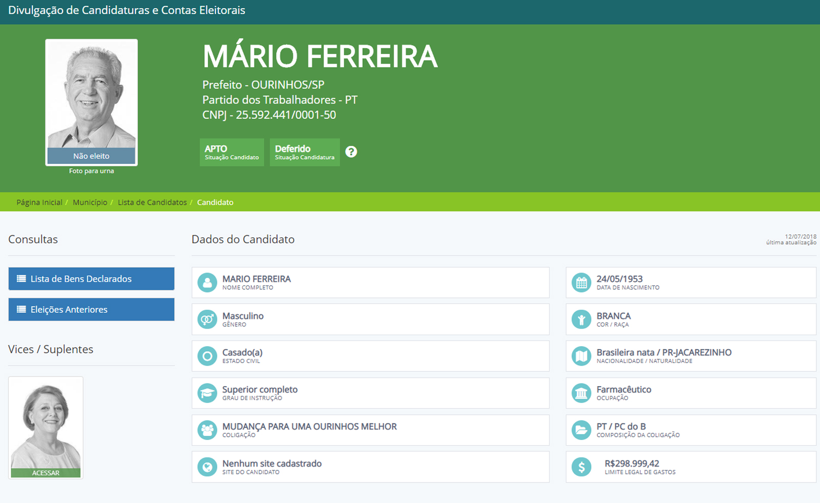 A campanha do farmacêutico Mário Ferreira, pelo PT, teria custado R$15.514,50. Mário, que foi o terceiro mais votado com 3.546 (6,46%), chegou a arrecadar R$24.804,00, sendo que só ele colocou R$22.500,00 (90.71%), porém ele recebeu algumas doações e teve a sobra de R$7.885,50. Confira os dados dele no ranking abaixo: