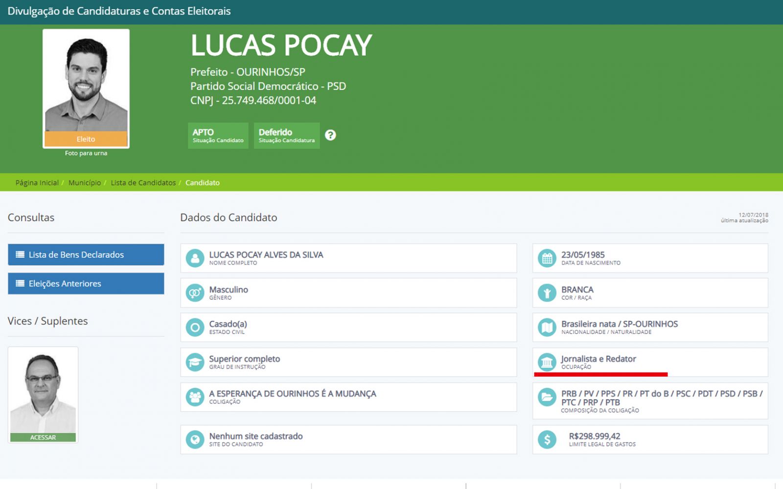 No site, Lucas aparece como Jornalista e Redator, sendo que na verdade ele seria formado em Direito.