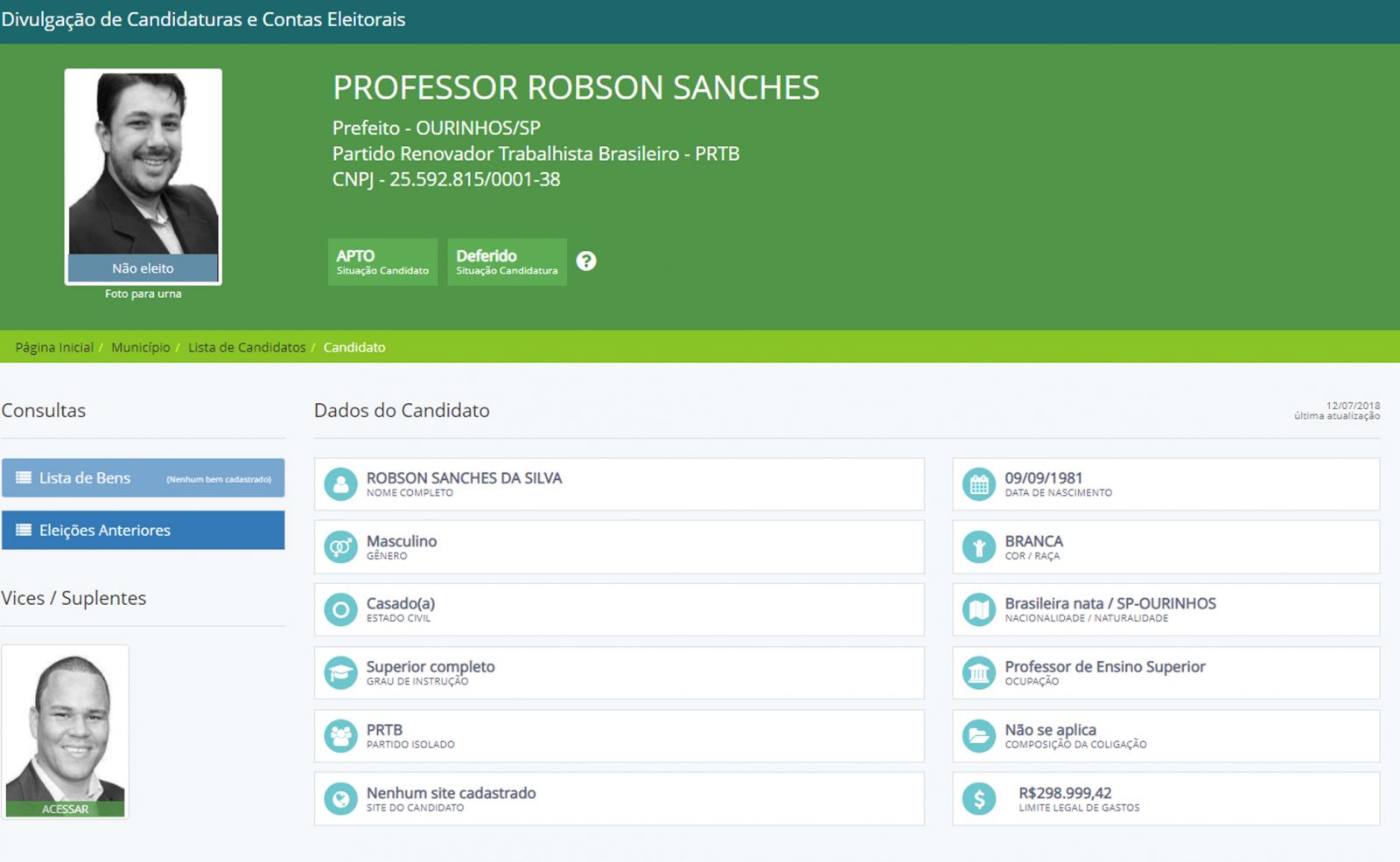 Também concorreu ao cargo de prefeito, em 2016, o professor Róbson Sanches (Patriotas), que na época estava no PRTB e teve a quarta maior votação, 2812 votos (5,12%). Sanches foi o que menos teria gastado, com o valor de R$200,02, oriundo de doação. O professor não teria gasto nem R$1 do seu bolso. Confira alguns dados: