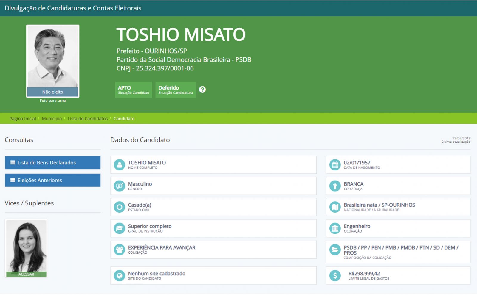 Nas últimas eleições, em 2016, em Ourinhos, a campanha mais cara foi a do ex-prefeito Toshio Misato, que concorreu pelo PSDB e obteve 14.328 votos (26,08 %), conforme o sistema DivulgaContas (clique aqui), da Justiça Eleitoral. O engenheiro declarou ter desembolsado R$233.551,24, sendo que o limite de gastos em 2016 era de R$298.999,42. Confira abaixo algumas informações de Toshio daquelas eleições abaixo: