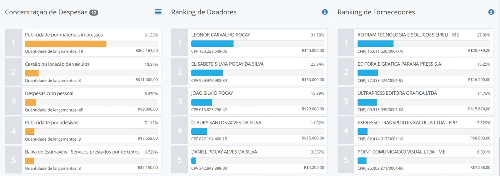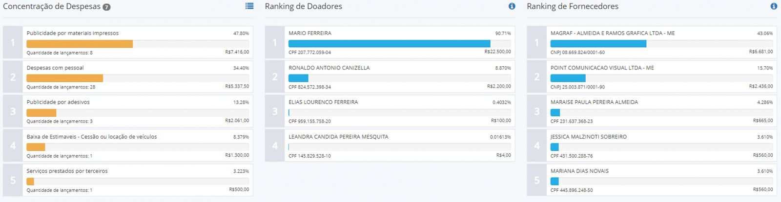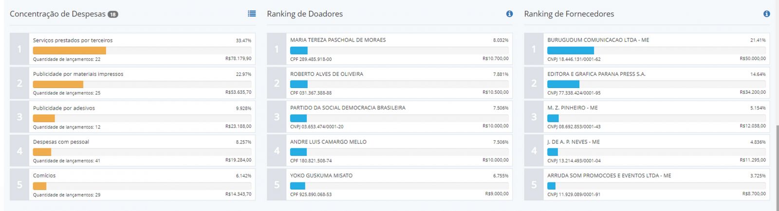 Do montante gasto, segundo sua declaração, R$ 10.803,91 foram investidos do próprio bolso, o que correspondeu a 8.03% do total. Confira os rankings abaixo: