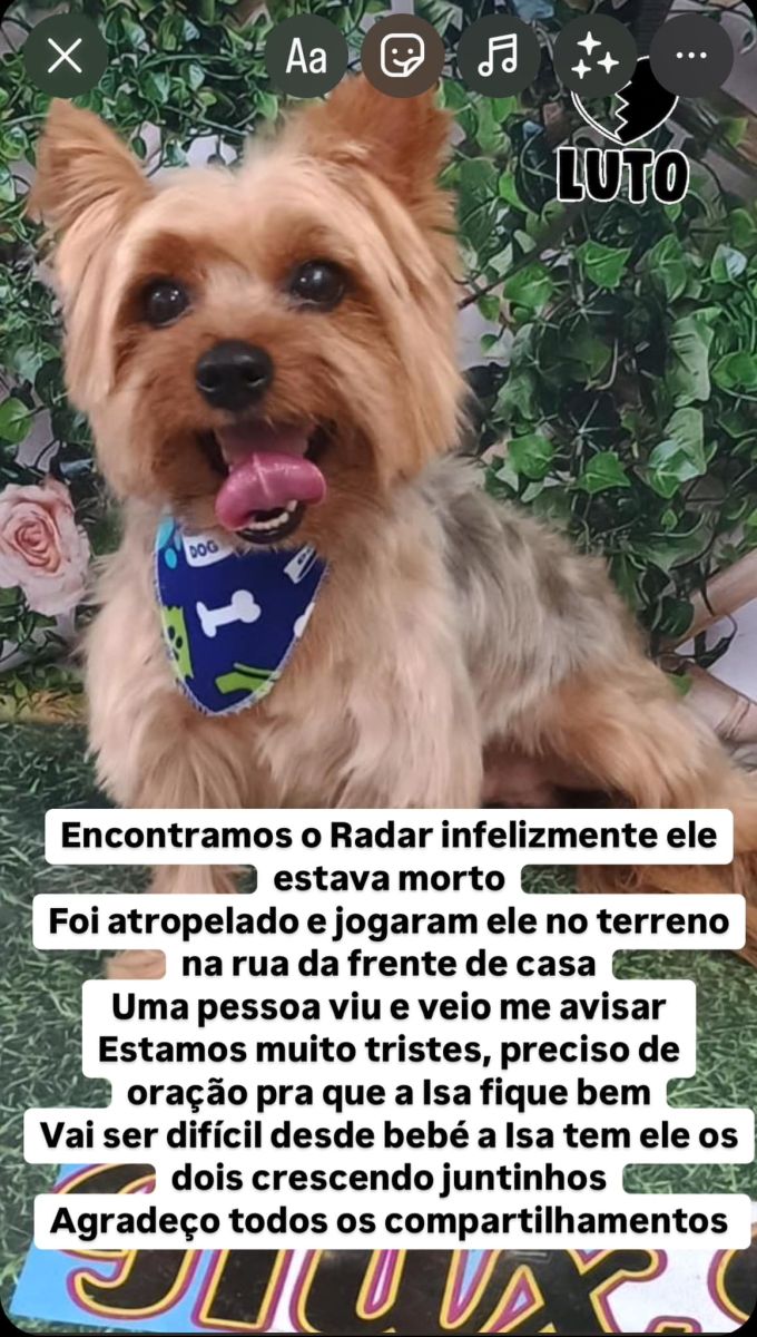 O cãozinho Radar, da raça Yorkshire, foi encontrado morto nesta quinta-feira, 12, conforme informou a família da pequena Isadora, uma criança com deficiência visual, através de uma postagem nas redes sociais.