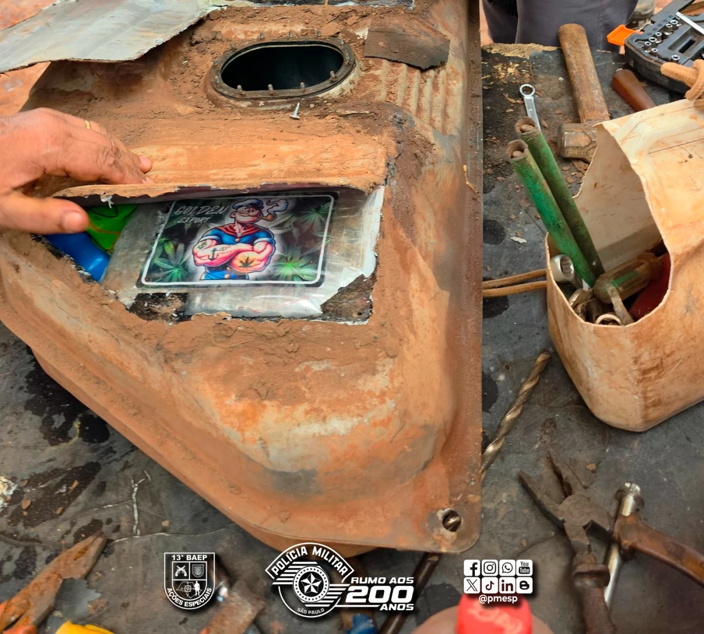 Durante a ação, o cão policial indicou a presença de odor de entorpecente em um Fiat Uno prata que, segundo a Polícia Militar, sequer constava na lista de automóveis que seriam leiloados. Diante da suspeita, a equipe realizou uma busca detalhada no interior do veículo e localizou, escondidos dentro do tanque de combustível, 15 tabletes de haxixe.