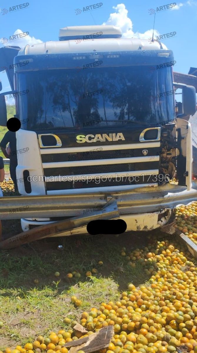 Com a queda das laranjas, o motorista perdeu o controle da direção, bateu contra o dispositivo de contenção do canteiro central e acabou tombando. A carreta, uma Scania R 124, ficou imobilizada ocupando as faixas 1 e 2 do sentido leste, causando interdição total dos dois sentidos da rodovia no momento inicial.
